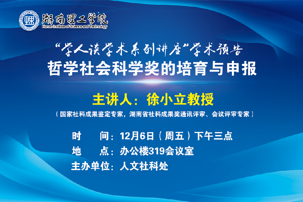 <span>主讲人:</span>徐小立<br/> <span>主题:</span>哲学社会科学奖的培育与申报<br/> <span>时间:</span>2019年12月6日(周五)下午三点<br/> <span>地点:</span>办公楼319会议室