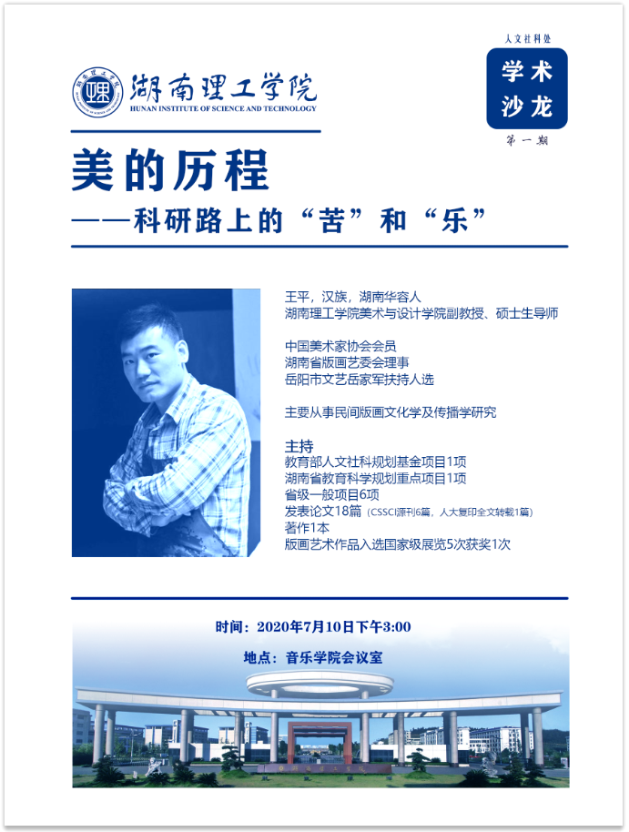 <span>主讲人:</span>王平<br/> <span>主题:</span>美的历程——科研路上的“苦”和“乐”<br/> <span>时间:</span>2020年7月10日(周五)下午15:00<br/> <span>地点:</span>音乐学院会议室