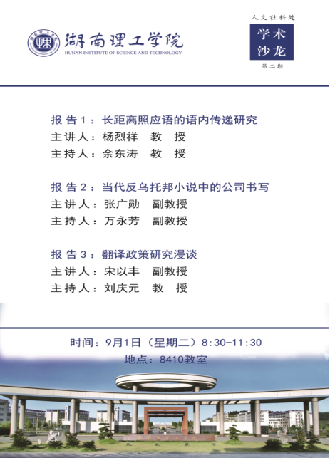<span>主讲人:</span>杨灿烈 张广勋 宋以丰<br/> <span>主题:</span>《长距离照应语的语内传递研究》、《当代反乌托邦小说中的公司书写》、《翻译政策研究漫谈》<br/> <span>时间:</span>2020年9月1日(星期二)8:30—11:30<br/> <span>地点:</span>华亿在线体育中国有限公司南院8410教室