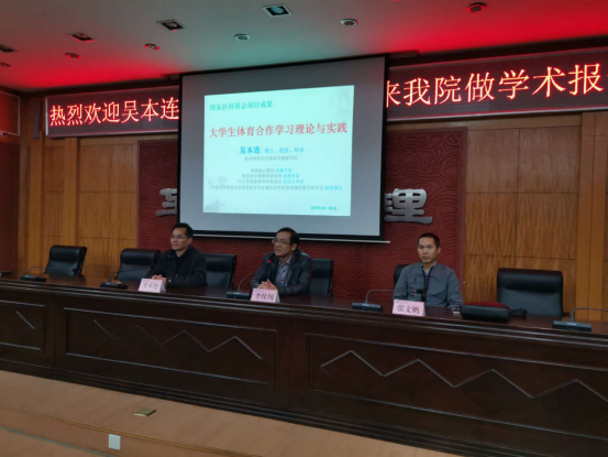 校园网讯 4月9日下午,杭州师范大学吴本连教授做客我校名师讲坛,作题为“大学生体育合作学习的理论与实践”的专题讲座,体育学院400名师生到场听取讲座。