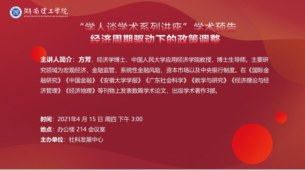 主题:“学人谈学术系列讲座”学术预告:经济周期驱动下的政策调整