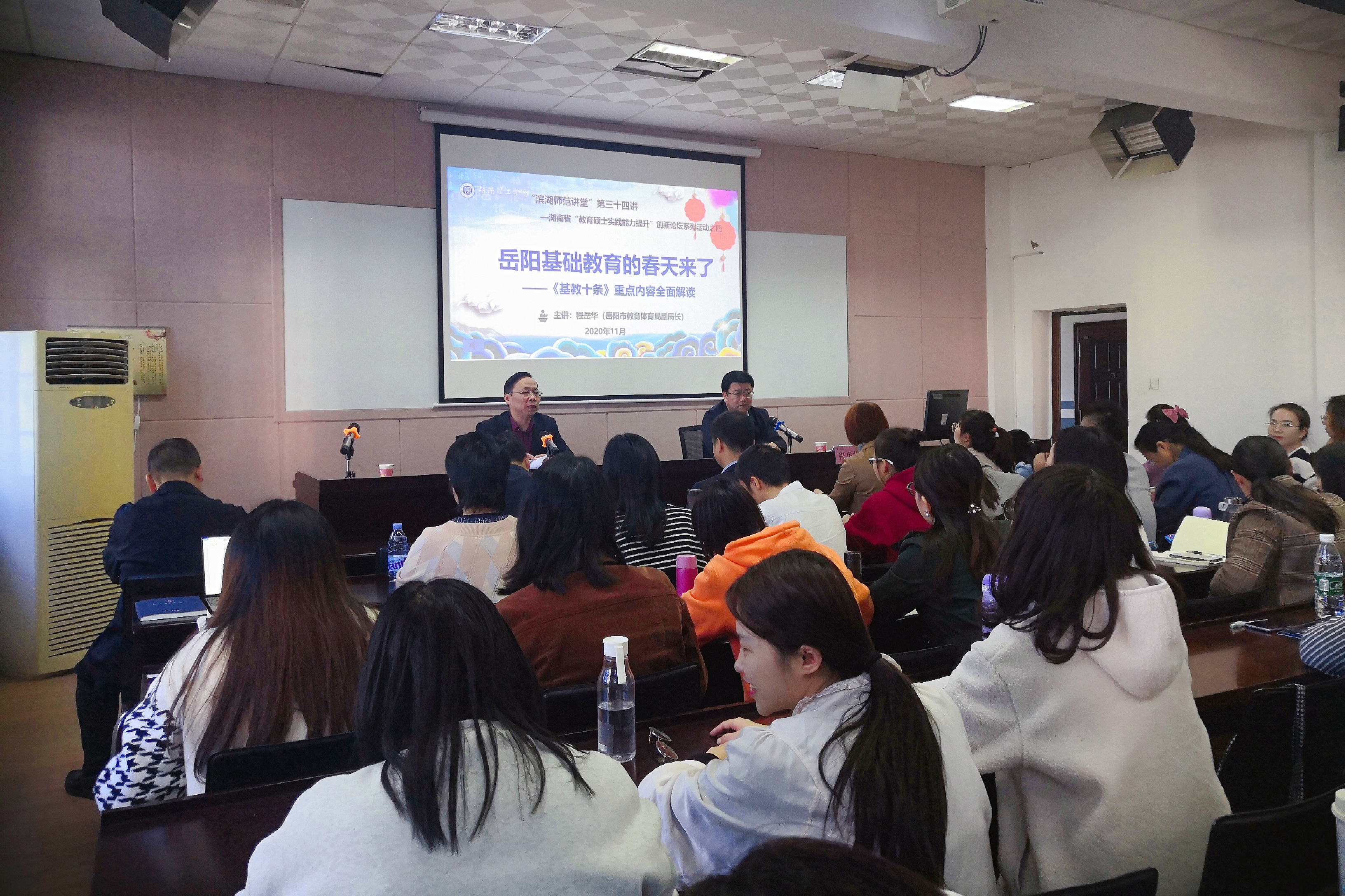 校园网讯 11月13日上午,由我校教育科学学院主办的湖南省“教育硕士实践能力提升”创新论坛系列活动之四(“滨湖师范讲堂”第三十四期)在1号教学楼1302教室举行。本期主题为“岳阳基础教育的春天来了——《基教十条》重点内容全面解读”。特邀岳阳市教育体育局副局长程岳华主讲,教科院总支书记刘淳松、副院长彭阳红和全体教育硕士研究生120余人参加了本次活动。本次讲座由教科院院长刘理主持。