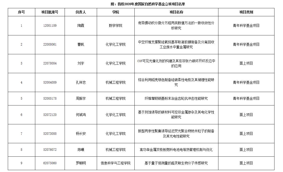 校园网讯 9月18日,国家自然科学基金委员会公布了2020年度国家自然科学基金项目评审结果,我校共有9个项目获立项资助,其中面上项目5项、青年项目4项(立项资助名单附后)。