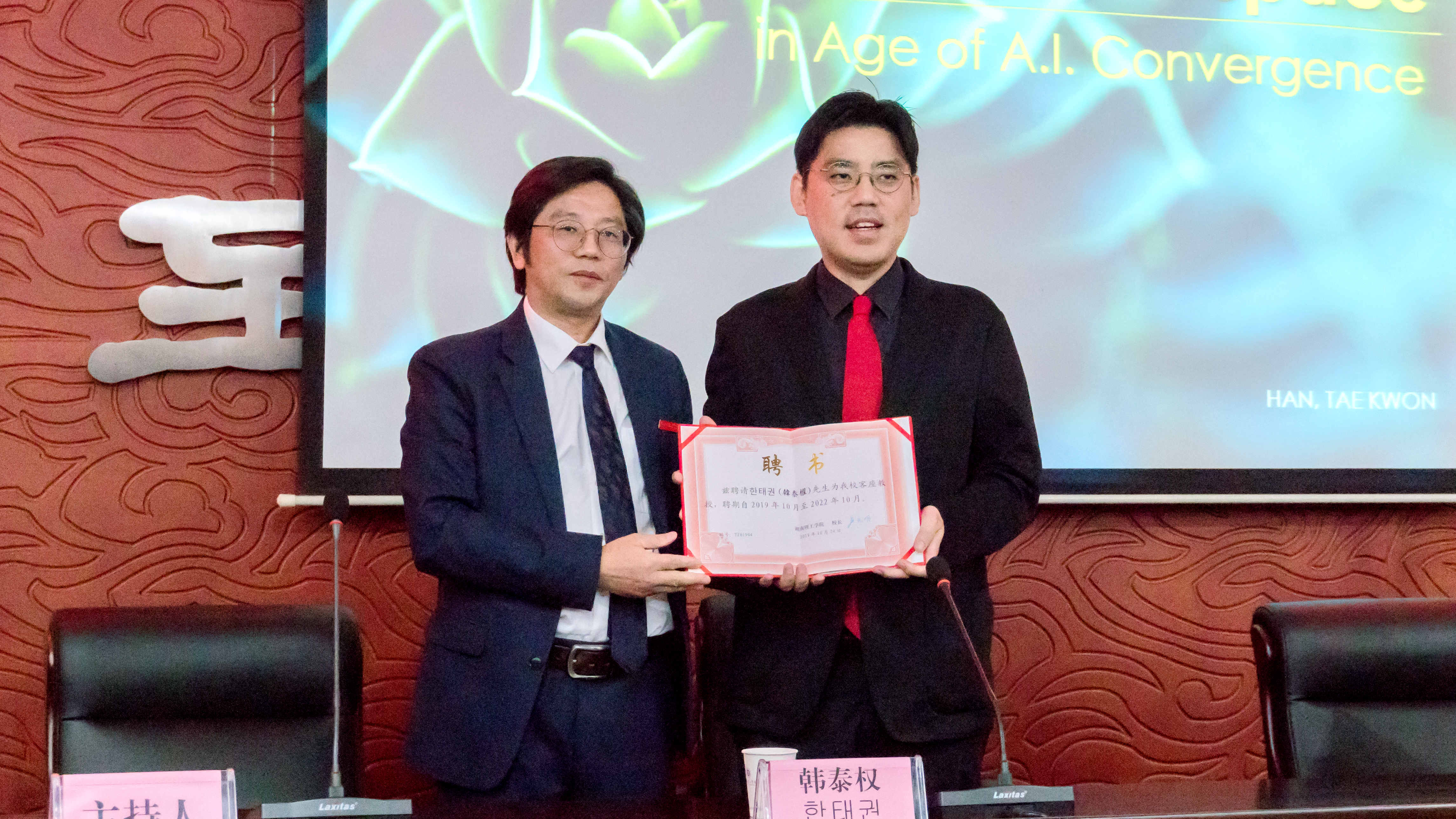 万长林对韩泰权的到来表示欢迎,并在讲座开始前并为韩泰权教授颁发聘书,以感谢其担任我校客座教授三年来为两地学术交流做出的贡献。