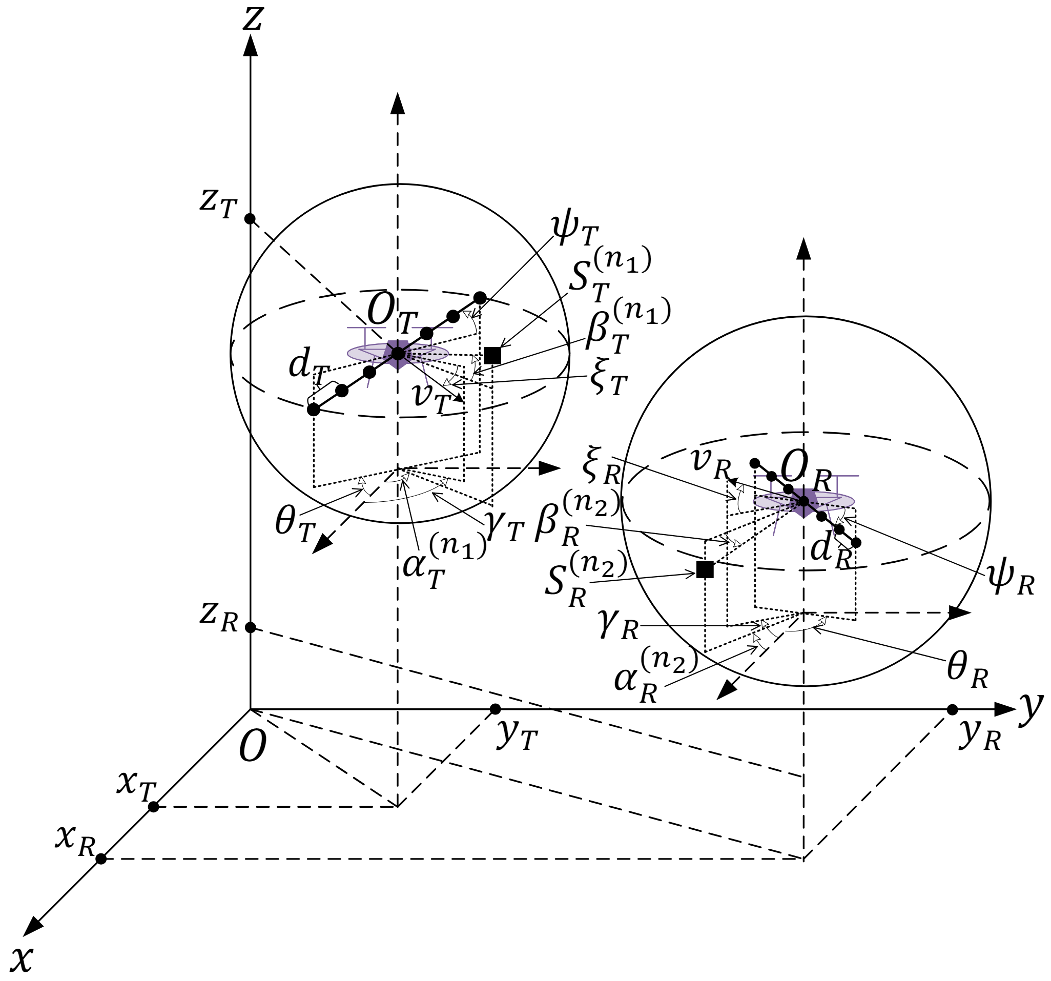 图1三维任意俯仰双圆球几何信道模型示意图