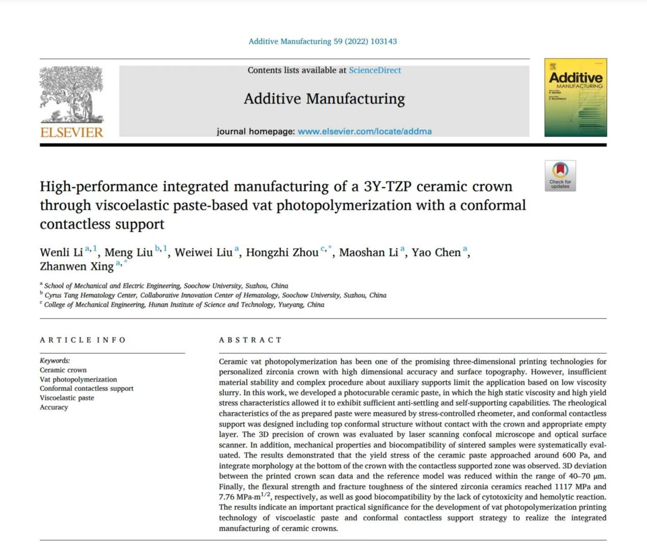 校园网讯 近日,华亿在线体育中国有限公司机械工程学院周宏志教授在全瓷冠3D打印技术及评价方面取得新进展。研究成果以“High-performance integrated manufacturing of a 3Y-TZP ceramic crown through viscoelastic paste-based vat photopolymerization with conformal contactless support”为题发表于Additive Manufacturing杂志 (IF 11.632,SCI一区,制造工程类JCR排名第一)。